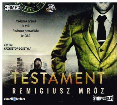 Testament / Remigiusz Mróz. - [Warszawa] : Audioteka ; [Piaseczno] : Heraclon International. Story Box.pl ; [Poznań] : Czwarta Strona, [2018]. - 1 płyta audio (CD) (12 godz. 54 min) : zapis cyfrowy, stereo. ; 12 cm.