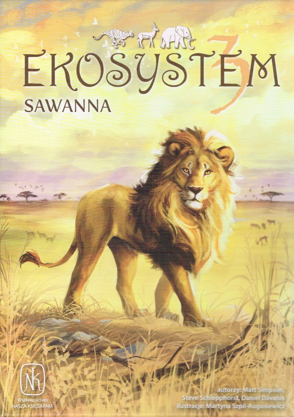 Zawartość: 132 karty: (20 x trawa, 14 x akacja 10 x wodopój, 20 x gazela, 12 x zebra, 10 x żyrafa, 10 x lew, 10 x hiena, 10 x gepard, 8 x słoń, 8 x sęp), 6 ściągawek, notes, ołówek, instrukcja.