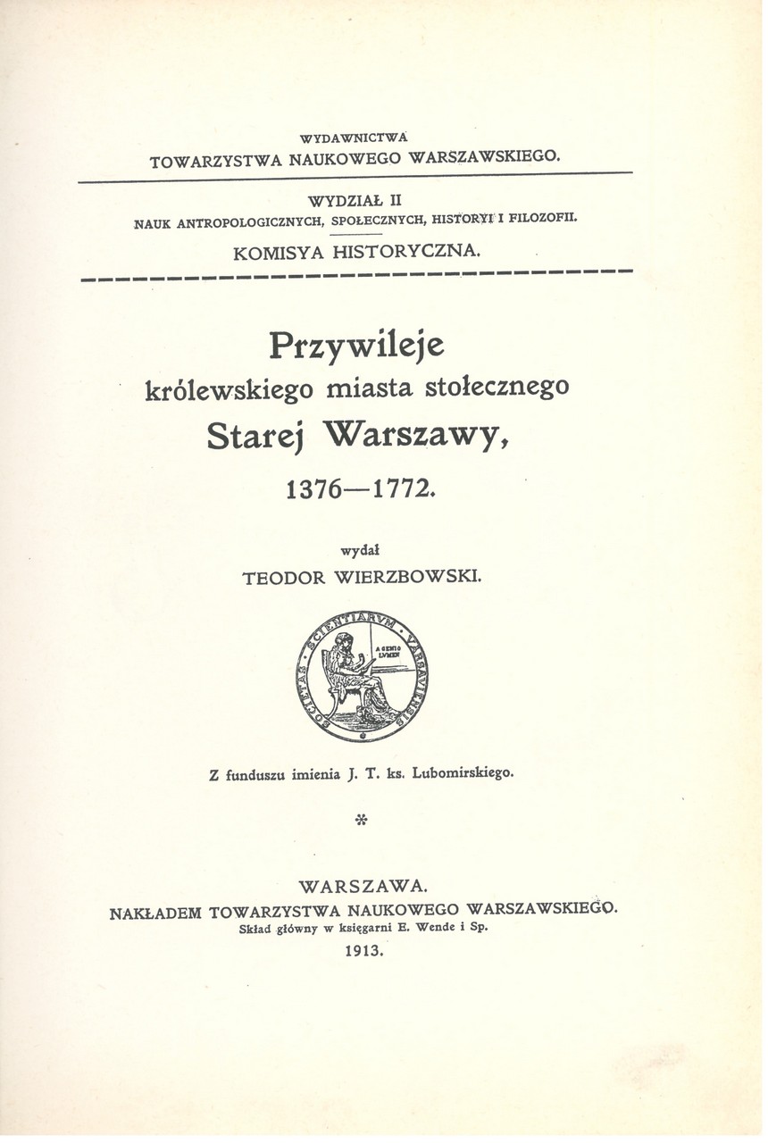 Przedr. typogr. Oryg.: Warszawa : nakł. Towarzystwa Naukowego Warszawskiego, 1913. Na s. tyt. nazwa serii. oryg.: Wydawnictwa Towarzystwa Naukowego Warszawskiego, Wydział II Nauk Antropologicznych Społecznych, Historii i Filozofii, Komisja Historyczna.