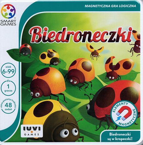 Zawartość: 1 metalowe pudełko z pokrywką, 12 magnetycznych biedronek (5 czerwonych, 4 pomarańczowe i 3 żółte), książeczka z zadaniami.